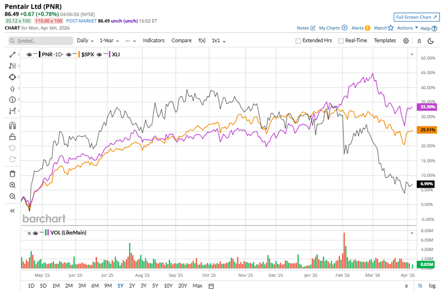 PNR stock has underperformed the S&P 500 Index’s ($SPX) 30.3% gains over the past 52 weeks, with shares up 9.8% during this period. Similarly, it underperformed the State Street Industrial Select Sector SPDR ETF’s (XLI) 39.6% gains over the same time frame.