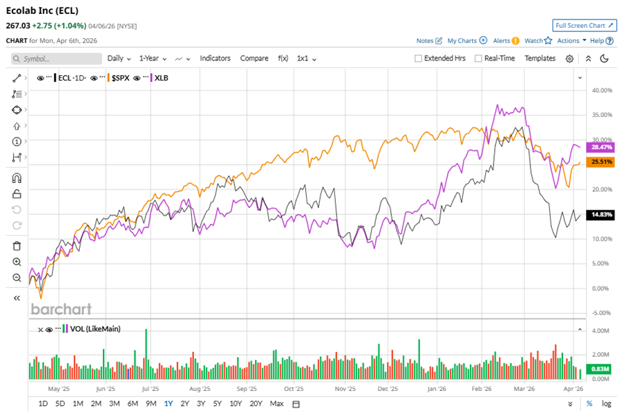 ECL stock has underperformed the S&P 500 Index’s ($SPX) 30.3% gains over the past 52 weeks, with shares up 12.3% during this period. Similarly, it underperformed the State Street Materials Select Sector SPDR ETF’s (XLB) 29% returns over the same time frame.