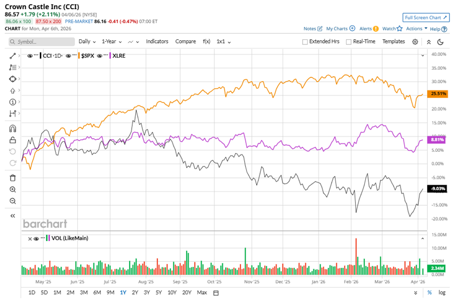CCI stock has underperformed the S&P 500 Index’s ($SPX) 30.3% gains over the past 52 weeks, with shares down 14.3% during this period. Similarly, it underperformed the State Street Real Estate Select Sector SPDR ETF’s (XLRE) 7.2% uptick over the same time frame.
