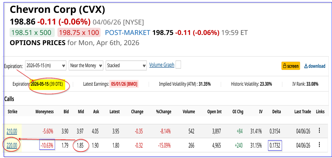 Now the investor can look at shorting new covered calls with May 15 CVX expiry call option contracts, 39 days from now.
