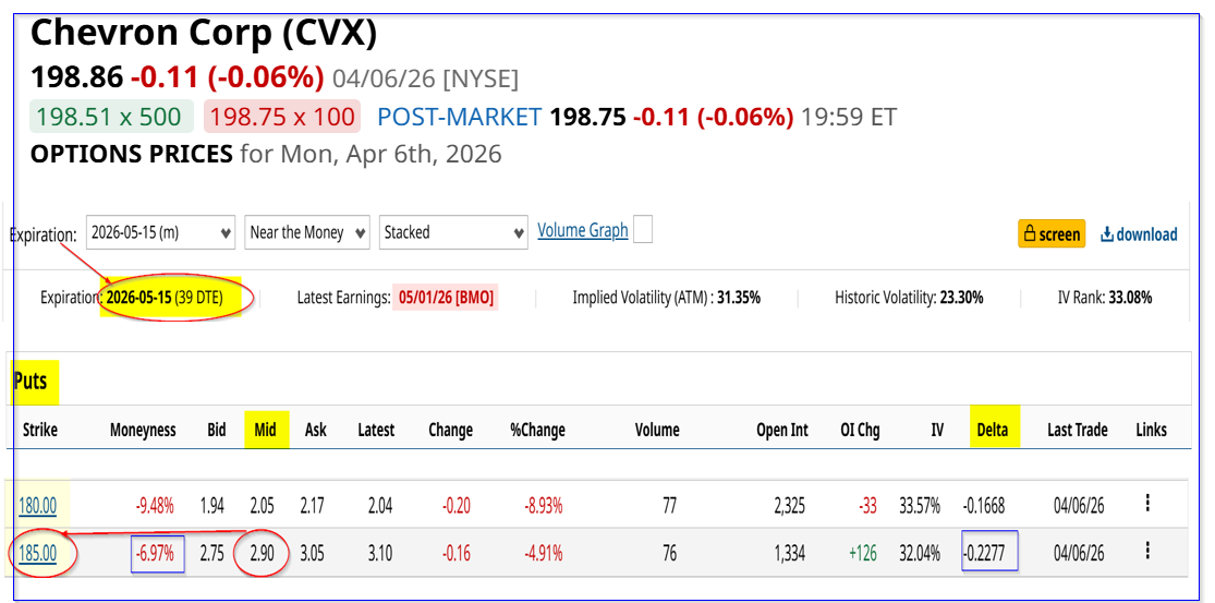 For example, an investor can enter an order to “Sell to Open” 1 put contract for May 15 expiry at the $185.00 strike price. That price is about 7% lower than today's price and would only obligate the investor to spend $18,500 to buy 100 shares if CVX fell to that price.