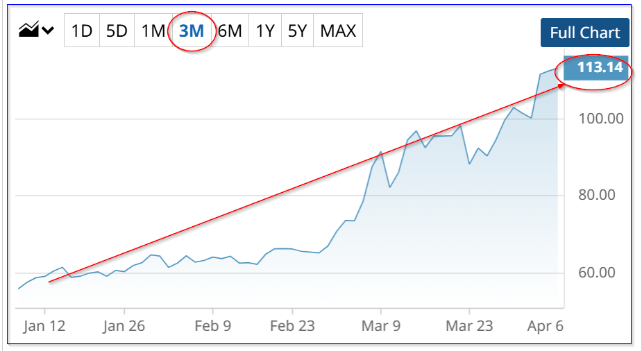 CVX closed at $198.86 on Monday, off its recent peak of $211.15 near the end of March (3/27). It's essentially been tracking the price of the West Texas Intermediate May Futures contract.