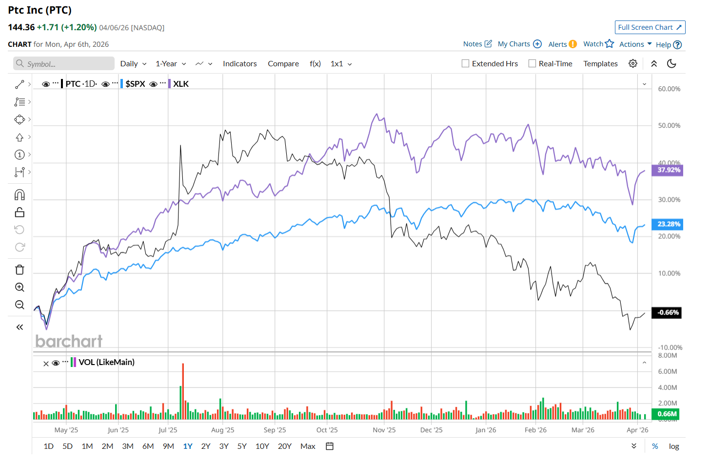 Shares of PTC have gained 3.3% over the past 52 weeks, considerably lagging both the S&P 500 Index's ($SPX) 30.3% return and the State Street Technology Select Sector SPDR ETF’s (XLK) 48% uptick over the same time period.