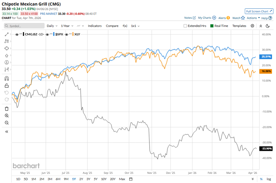 Shares of Chipotle Mexican Grill have declined 28.8% over the past 52 weeks, lagging behind the S&P 500 Index's ($SPX) 30.3% gain and the State Street Consumer Discretionary Select Sector SPDR ETF's (XLY) 19.7% rise over the period.
