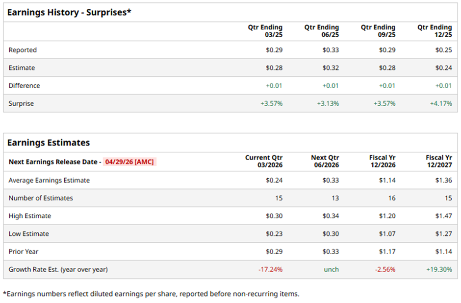 The Newport Beach, California-based company is set to announce its fiscal Q1 2026 results after the market closes on Wednesday, Apr. 29. Analysts predict CMG to report an EPS of $0.24, a 17.2% decrease from $0.29 in the year-ago quarter. However, it has surpassed Wall Street's earnings estimates in the past four quarters.