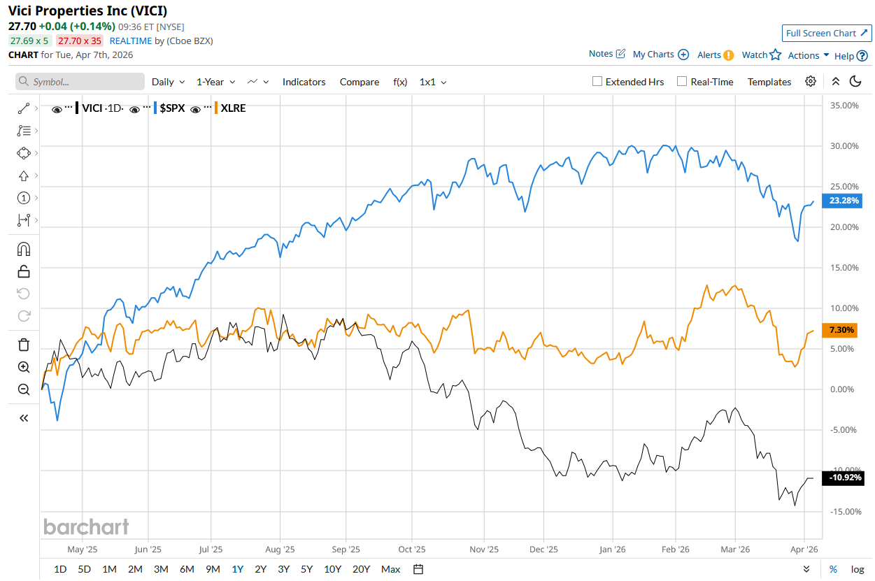 VICI Properties shares have fallen 7% over the past 52 weeks, lagging behind the S&P 500 Index’s ($SPX) 30.3% rise and the State Street Real Estate Select Sector SPDR ETF’s (XLRE) 7.2% rise during the same time frame.