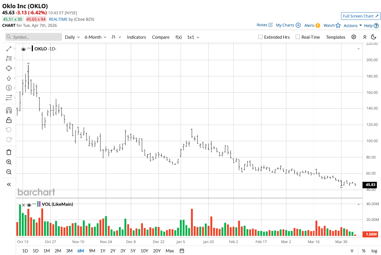 In October 2025, OKLO stock had touched highs of $193.84. From those levels, there has been a steep correction of 75%. The significant downside can be attributed to two factors.