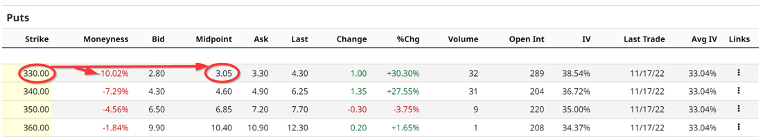 The premium received by shorting cash-secured puts at the $330 strike price is even higher at $3.05 per share or 0.92% on the $330 strike price. This means that the investor puts up $33,000 with the brokerage firm to cover the potential purchase of 100 shares from shorting 1 put contract at $330. In return, the investor receives $305 for the short put contract. So $305/$33,000 investment works out to 0.92% for the cash-secured put investor.