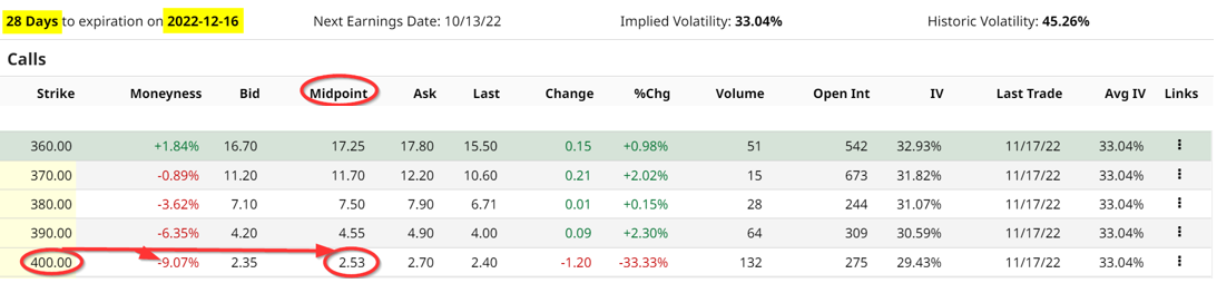 Call options for the period ending Dec. 16, which is 26 days from now, offer attractive covered call opportunities. For example, the $400 strike price, which is 9.07% over today's price, are priced at $2.53 per call option.