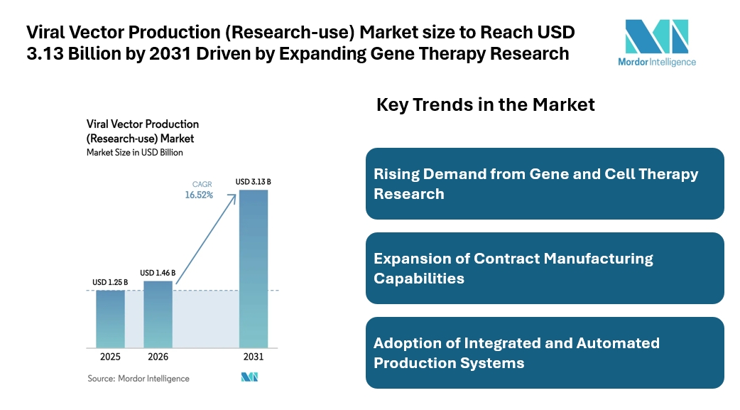 According to Mordor Intelligence, the viral vector production (research-use) market size was valued at USD 1.25 billion in 2025 and is expected to grow to USD 1.46 billion in 2026, reaching USD 3.13 billion by 2031, registering a CAGR of 16.52% during the forecast period. This growth reflects the rising reliance on viral vectors in preclinical and early-stage clinical research across multiple therapeutic areas.