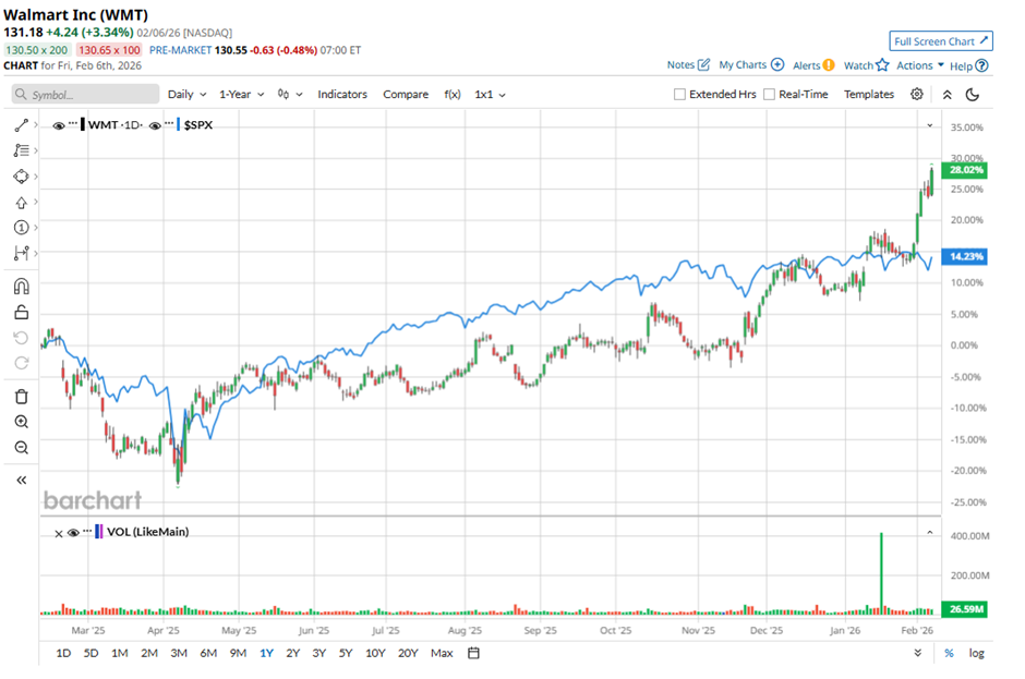 Fresh off crossing the $1 trillion market capitalization mark earlier this month, Walmart now stands as the first major brick-and-mortar retailer to reach a valuation tier typically reserved for tech titans. The stock’s climb has been just as notable. Over the past 52 weeks, WMT shares have advanced 27.5%, and in 2026 alone, the stock is already up a striking 17.8%.