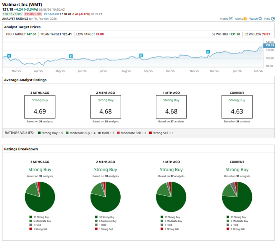 Sentiment on Walmart remains firmly tilted to the bullish side. WMT stock currently holds a consensus “Strong Buy” rating from Wall Street, reflecting broad confidence in the retailer’s outlook. Of the 38 analysts covering the company, 29 rate it a “Strong Buy,” six recommend a “Moderate Buy,” two suggest “Hold,” and just one analyst lands on a “Strong Sell.”