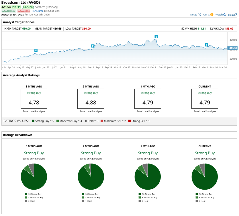 Wall Street remains bullish about AVGO stock and maintains a “Strong Buy” consensus rating. The average analyst price target of $466.65 implies a potential upside of more than 43% from recent trading levels.