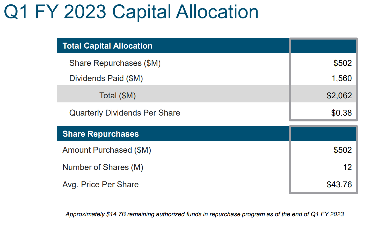 As a result, the company said it returned $2.1 billion to stockholders through share buybacks and dividends. This included $1.6 billion in dividends at 38 cents per share and $0.5 billion in 12 million shares it repurchased.