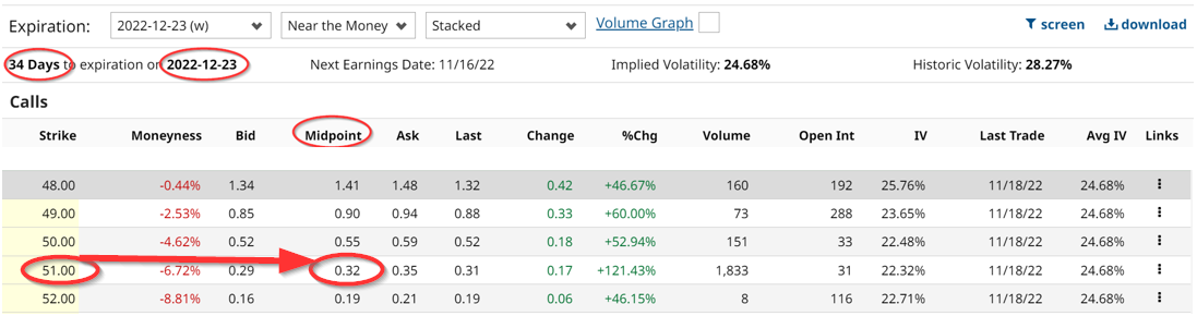 Investors who sell covered calls and puts at out-of-the-money (OTM) strike prices can bring attractive income opportunities. For example, the call options expiring Dec. 23 at the $51.00 strike price offer a premium of 32 cents per call contract.