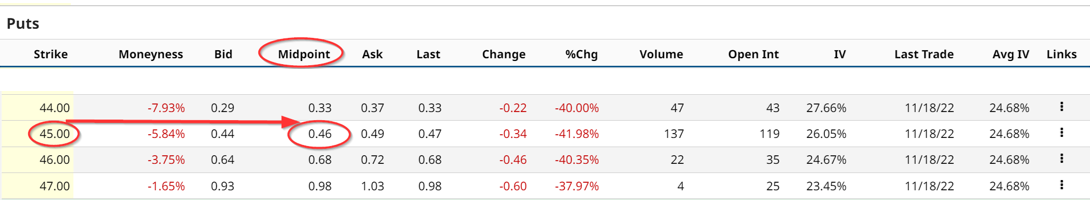 The same is true with OTM puts that an investor sells short on a cash-secured basis. For example, if the investor were to put up $4,500 with their brokerage firm (or use up their margin to do so), they can sell one put contract at $45.00 per share for the same Dec. 23 expiration period. This is almost 6.0% below today's price.