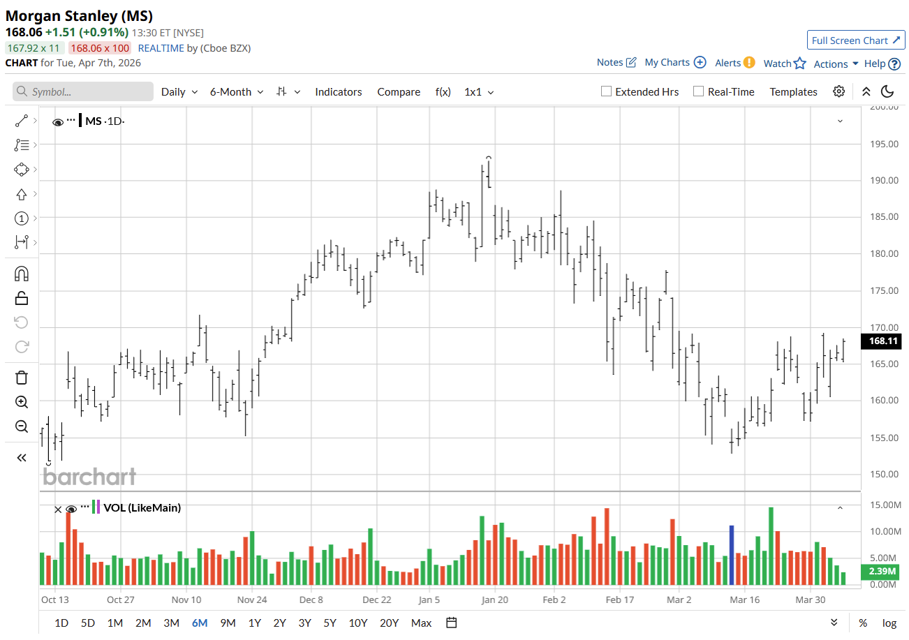 Ahead of its Q1 earnings, MS stock is receiving considerable analyst attention. On April 7, UBS analyst Erika Najarian upgraded the stock from “Neutral” to “Buy” while also raising her price target from $195 to $196. The firm sees the recent pullback, caused by the geopolitical tensions and AI disruptions, as a buying opportunity. It highlighted the company’s leading position in the wealth management and advisory business and the potential for major IPOs as major upcoming catalysts.