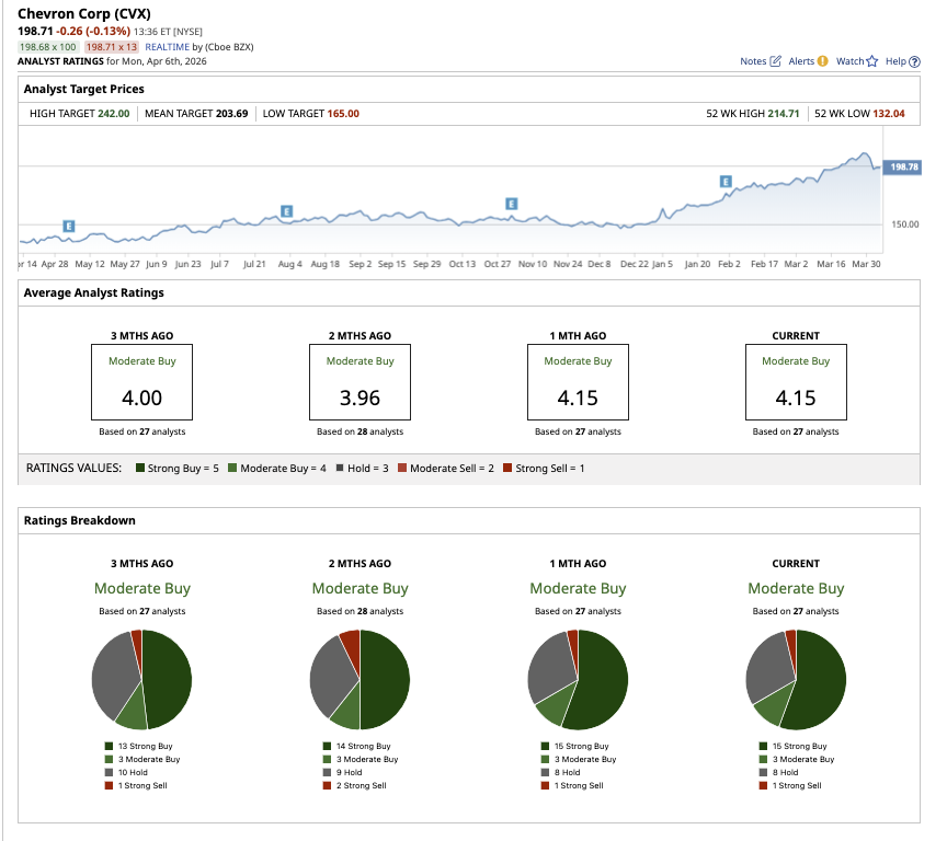On Wall Street, Chevron stock has earned a “Moderate Buy” consensus rating. Of the 27 analysts covering the stock, 16 rate it a “Strong Buy,” three have a “Moderate Buy,” seven rate it a “Hold,” and one analyst has a “Strong Sell" rating. The average target price of $205.88 offers just 2% potential upside from current levels, while the high price target of $242 points to a possible 20% gain.