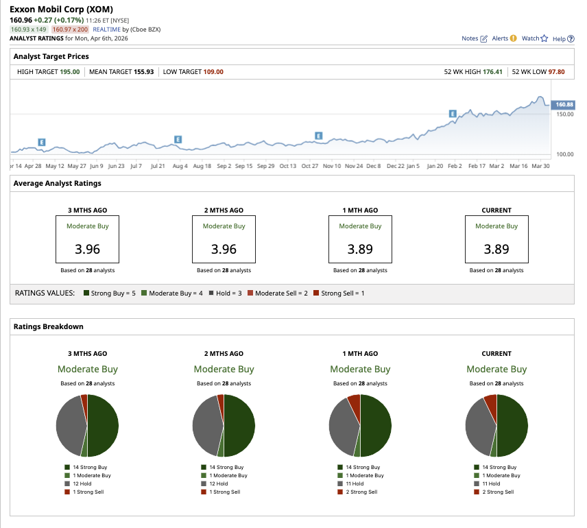 Overall, analysts rate XOM stock as a consensus “Moderate Buy.” Of the 28 analysts covering the stock, 14 rate it a “Strong Buy,” one has a “Moderate Buy," 11 rate it a “Hold,” and two analysts have a “Strong Sell" rating. XOM stock has surpassed the average target price of $158.15. The highest target price of $195 suggests potential upside of 20% over the next 12 months.