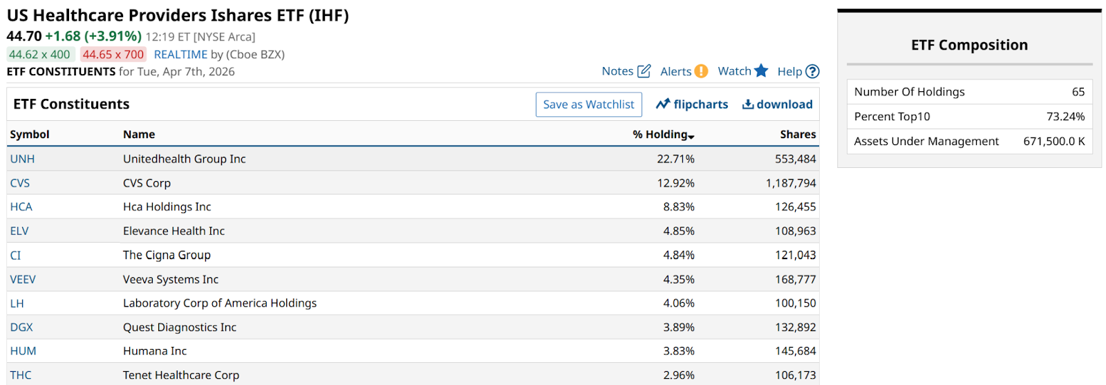 UNH is the cornerstone of the IHF basket, currently accounting for more than 22% percent of total ETF assets. This means that if you own IHF, you are making a concentrated bet on UnitedHealth, but you are also surrounding it with the other major players— CVS (CVS), HCA Holdings (HCA), Elevance (ELV), and Cigna (CI). All of these companies are navigating the same stormy regulatory waters.
