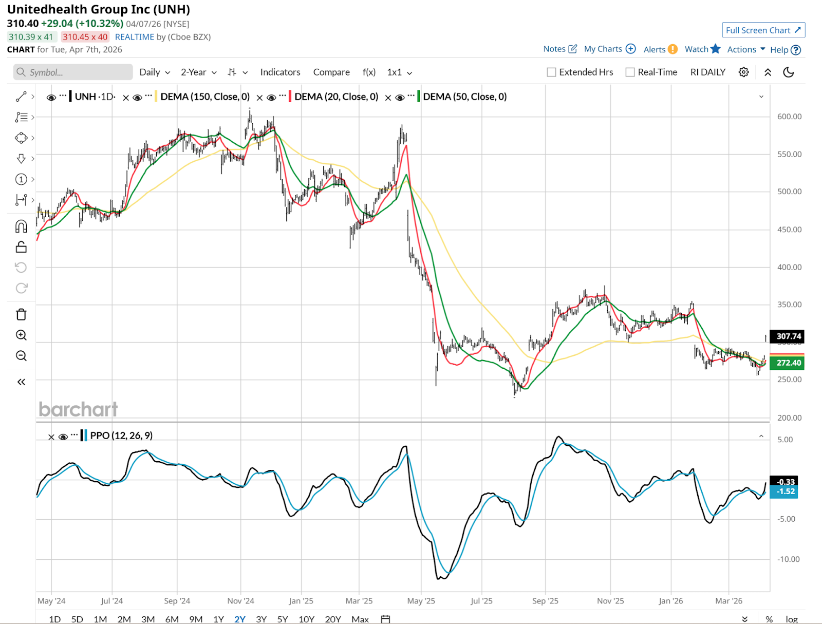 Since that time, the narrative has shifted from “growth at any cost” to a disciplined, almost defensive, focus on margin preservation. Oh, and the stock cratered, such that Tuesday morning’s more-than-10% pop still left UNH 50% below its all time high.