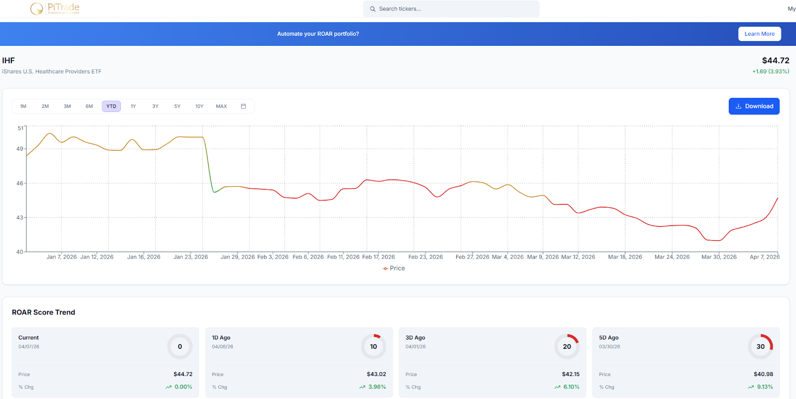 Investors and traders are confused by the seemingly endless whipsaw around the healthcare industry. And IHF’s ROAR Score reflects that. It is “fighting the rating” which actually stood at 0 momentarily, and has been below 40 for the past month.