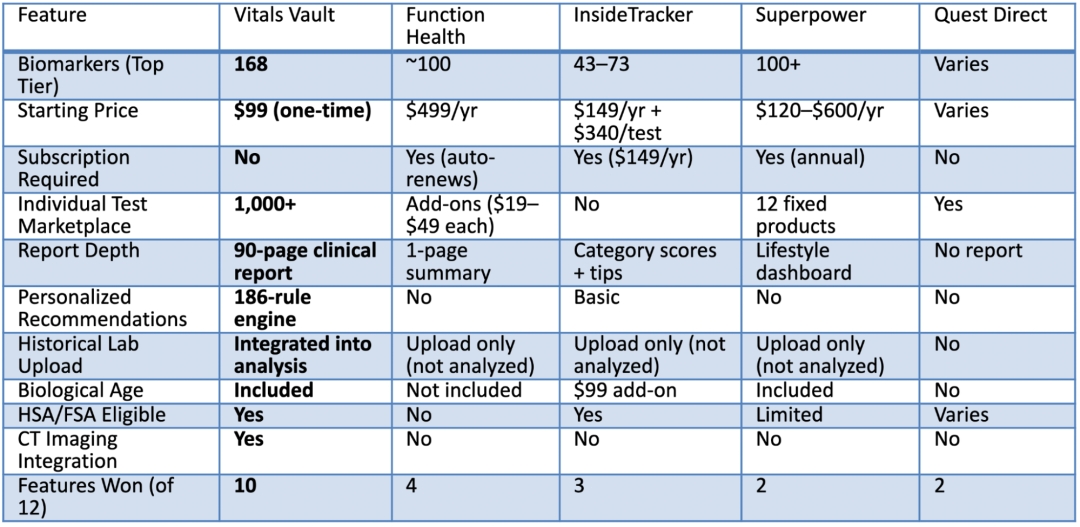 Vitals Vault has published full, transparent comparisons on its website for each competitor, updated regularly. The company states it is the only platform offering comprehensive lab testing, AI clinical reports, an intelligence-driven recommendation engine, historical data integration, and advanced imaging — all without a subscription.
