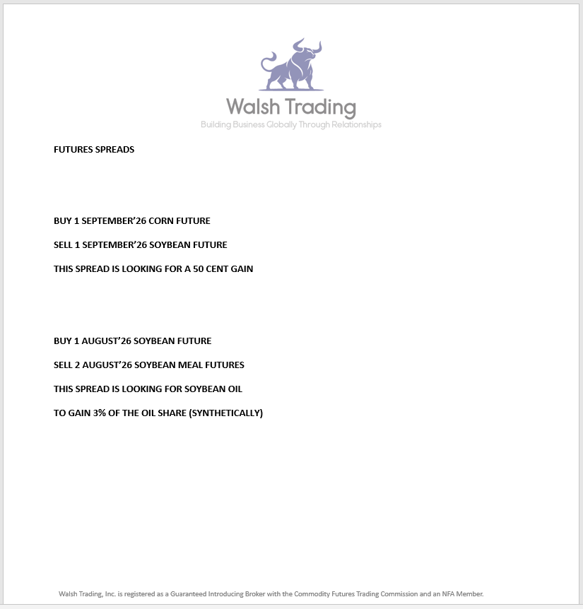 The Grain Markets were mixed today, with the Soybeans and Corn diving lower and the Wheat closing a little higher today. May'26 Soybeans were 8 ½ cents lower today and settled at 1158 ¼. Today's high was 1170 ½ and the 1-month and contract high are 1238 ¾. Today's low was 1155 ¼ and the 1-month low is 1145 ¼. Since 3/6 May'26 Soybeans are 42 ¼ cents lower or more than 3 ½%. May'26 Corn dipped lower today. May'26 Corn was 5 cents lower today and settled at 449. Today's high was 455 and the 1-month high is 476. Today's low was 448 ¼ and the 1-month low is 445 ½. Since 3/6 May'26 Corn is 11 ¼ cents lower or almost 2 ½%. The Wheat Market settled a little higher today. May'26 Wheat was 2¾ cents higher today and settled at 598. Today's high was 600 ½ and the 1-month high is 641 ¾. Today's low was 588 and the 1-month low is 577 ¾. Since 3/6 May'26 Wheat is 18 cents lower or almost 3%. The Grain Markets have been watching world events as well and most of them traded lower today. If the Crude Oil Market sinks lower tonight, I feel it can break the Wheat Market as well. I still feel all of the Grain Markets are overpriced and recommend Bear Spreading all of the Grain Futures, except Soybean Oil. I have talk about the Soybean Oil for a while, and you can see why. It has performed very well so far this year, and I do not believe it is done yet. There could be a pullback if Crude Oil breaks hard, but that would be a buying opportunity. I still like the Soybeans to head toward the 1100 level, Corn to slowly drift lower, the Wheat Market to sink another 50 cents or more, and the Soybean Meal to trade below 300.00. It could be a very volatile evening in the Markets and tomorrow could be crazy. I recommend checking to see if you have any resting orders before everything opens back up tonight. There's lots of opportunity and plenty of action in the Option Markets. Give me a call if you would like to know more or are ready to open an account.