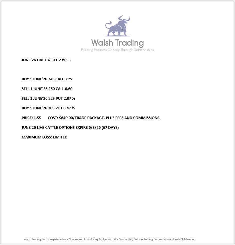 New contract highs in the June'26 Live Cattle. That feels good, and another 15-dollars higher looks very possible to me. I heard some 245's traded in the cash market today, and then that bid was passed with an offer at 247. The 260 level is starting to look like a good target level in the June'26 Fats, and the total open interest in the Live Cattle over the last 5-days (excluding today) has increased 8766 contracts The Feeders look good as well, and the May'26 Feeders settled above the 370 level. The May'26 Feeders are in the Gap and need to trade 374.77 ½ to fill it. The contract high is just 1.92 ½ above the top of the Gap at 376.70. I put on new upside Option Trades in the Fats today, let me know if you would like to know more. There are Trades from earlier this week below. Give me a call if you have any questions.