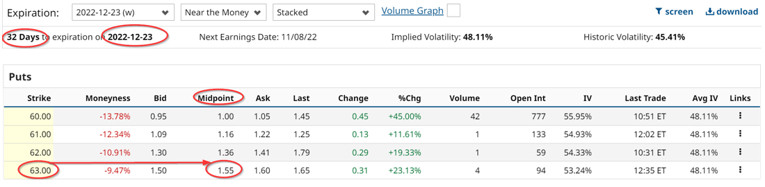 One way to profitably do this as well as collect some income is to sell out-of-the-money (OTM) cash-secured put options. For example, the Dec. 23 put option chain with Barchart shows that the $63.00 strike offers a premium at $1.55 per contract.