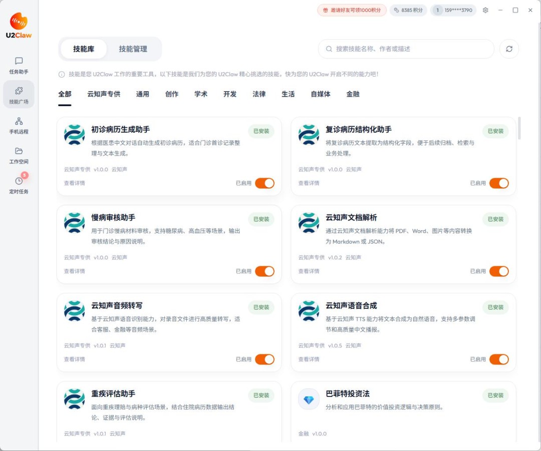 U2Claw deeply integrates Unisound’s market-proven AI capabilities. It natively connects three core modules—document processing, automatic speech recognition (ASR), and text-to-speech (TTS)—while seamlessly incorporating domain-specific models such as those in the healthcare sector. These core capabilities are powered by Unisound’s mature, officially released models and are packaged into modular Skills, ensuring stable and efficient performance across a wide range of application scenarios.