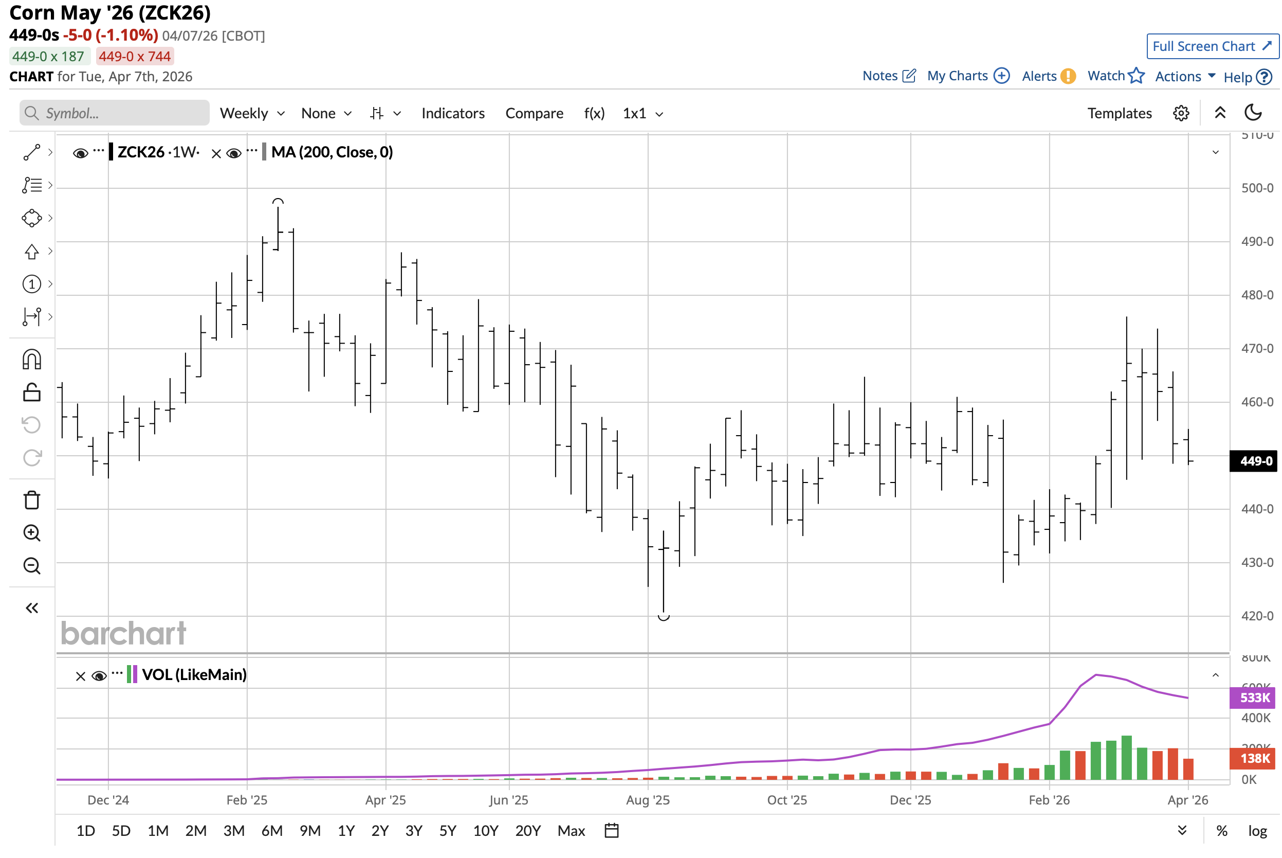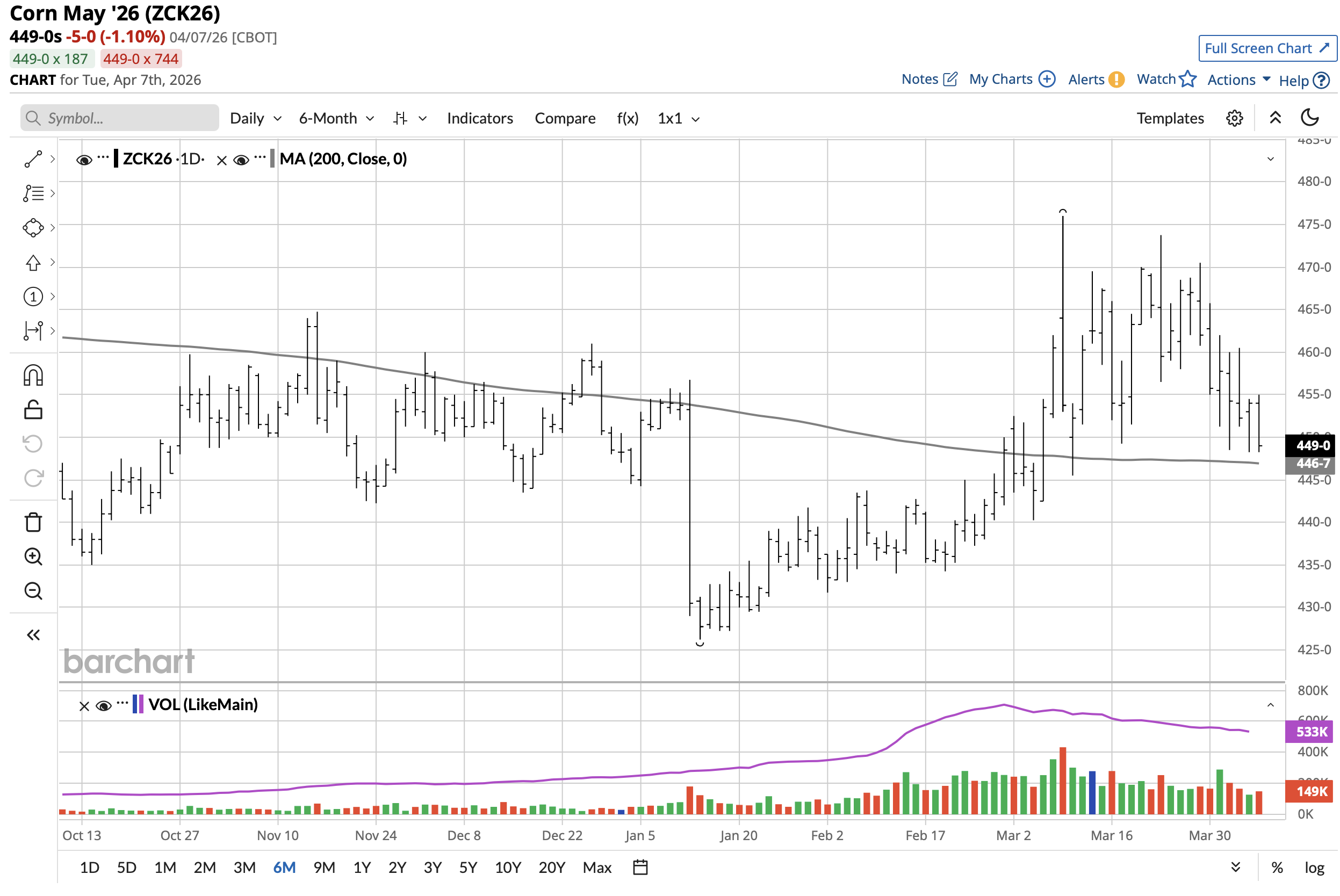 Tonight, corn is gapping lower. At 7:12 pm CDT, May 2026 Corn was trading at 443.0, down 6.0 from the close today at 3 pm.