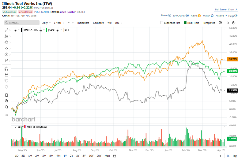 ITW stock has surged 16.2% over the past year, underperforming the S&P 500 Index’s ($SPX) 30.7% rise and the State Street Industrial Select Sector SPDR ETF’s (XLI) 39.9% return during the same time frame.