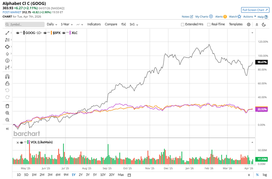 GOOG stock has notably outperformed the S&P 500 Index’s ($SPX) 30.7% gains over the past 52 weeks, with shares up 103.7% during this period. Similarly, it considerably outpaced the State Street Communication Services Select Sector SPDR ETF’s (XLC) 28% gains over the same time frame.