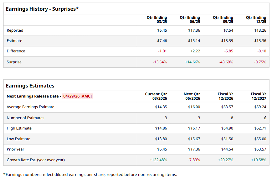 Everest Group, Ltd. (EG), headquartered in Hamilton, Bermuda, provides reinsurance and insurance products. Valued at $13.3 billion by market cap, the company offers property, casualty, and specialty reinsurance and insurance solutions, as well as claims management and support services. The leading global research firm is expected to announce its fiscal first-quarter earnings for 2026 after the market closes on Wednesday, Apr. 29.