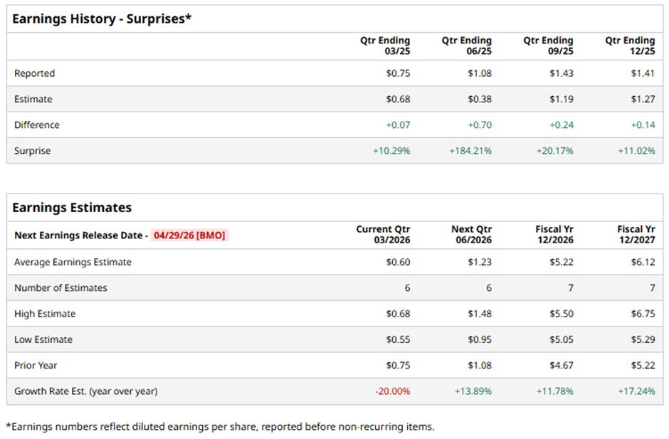 The New Britain, Connecticut-based company is expected to announce its fiscal Q1 2026 results before the market opens on Wednesday, Apr. 29. Ahead of this event, analysts forecast SWK to report an adjusted EPS of $0.60, down 20% from $0.75 in the year-ago quarter. However, it has surpassed Wall Street's earnings estimates in the last four quarters.