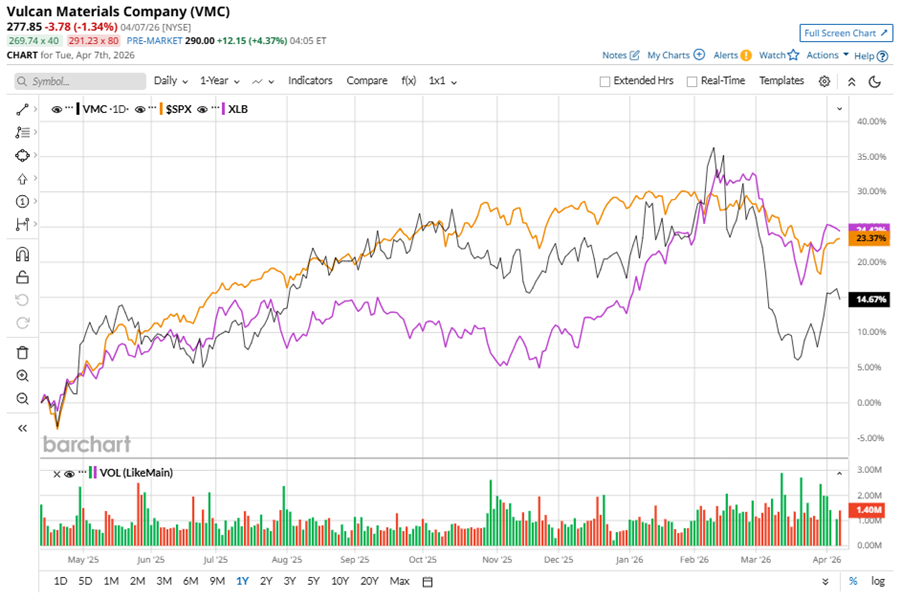 VMC stock has underperformed the S&P 500 Index’s ($SPX) 30.7% gains over the past 52 weeks, with shares up 21.6% during this period. Similarly, it lagged behind the State Street Materials Select Sector SPDR ETF’s (XLB) 30.7% returns over the same time frame.