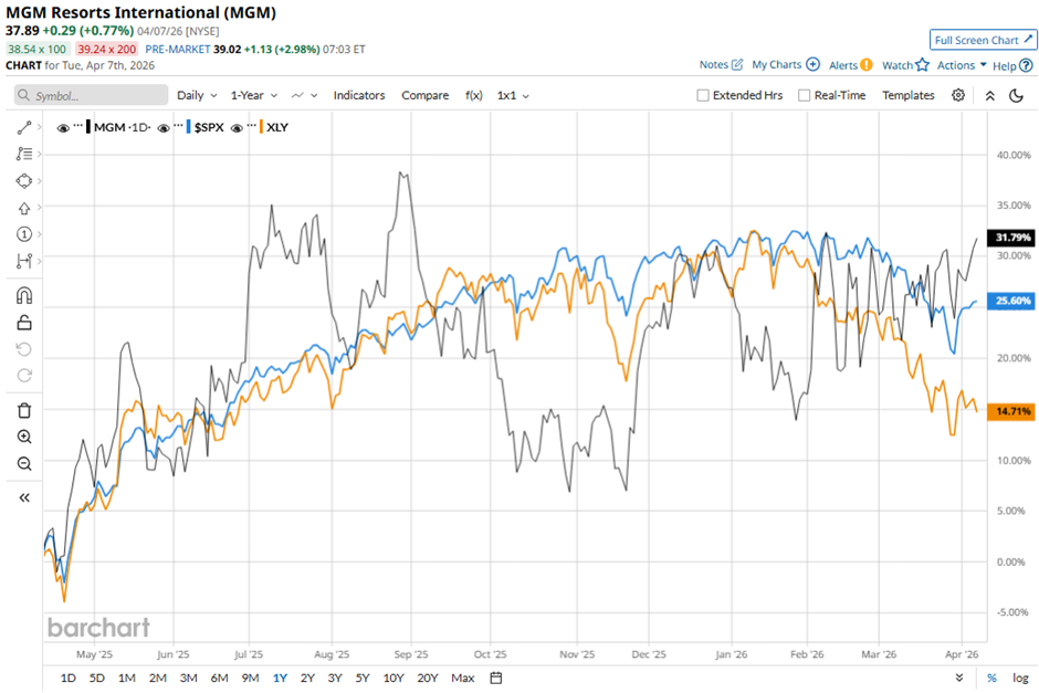 Shares of MGM Resorts have climbed 44.1% over the past 52 weeks, surpassing both the S&P 500 Index's ($SPX) 30.7% gain and the State Street Consumer Discretionary Select Sector SPDR ETF's (XLY) 19.3% increase over the period.