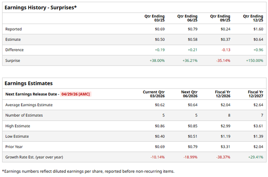 The Las Vegas, Nevada-based company is expected to announce its Q1 2026 results after the market closes on Wednesday, Apr. 29. Ahead of this event, analysts expect MGM Resorts to report an adjusted EPS of $0.62, down 10.1% from $0.69 in the year-ago quarter. It has exceeded Wall Street's earnings estimates in three of the last four quarters while missing on another occasion.