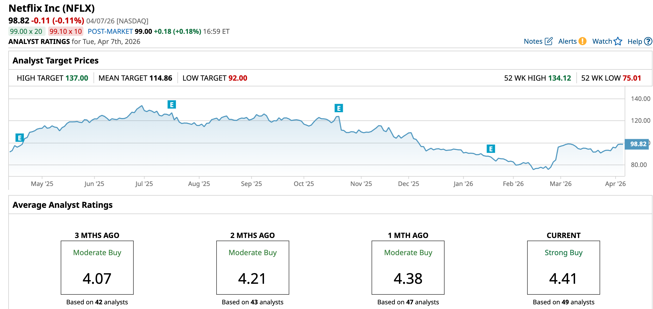 The mega-cap streamer’s shares have been moving through an interesting phase – part strength, part reset. Over the past 52 weeks, shares are up a solid 13.87%, reflecting confidence in its subscription growth and steady revenue engine. But that strength comes with context. The stock is still down about 26% from its high of $134.12, indicating sentiments cooling since then.