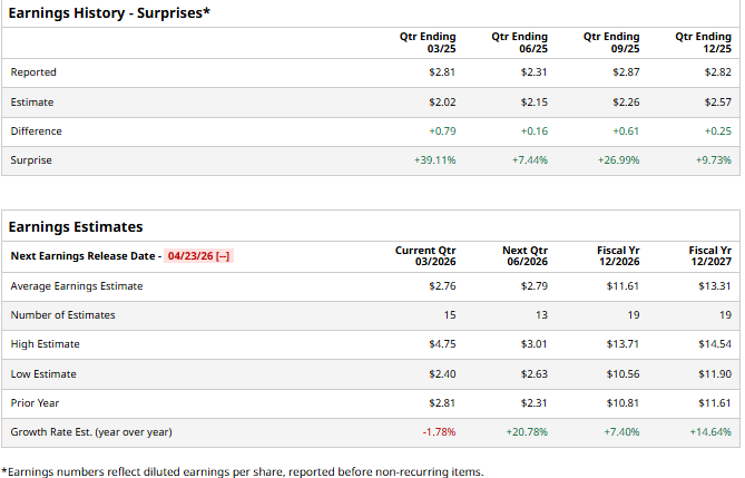 Alphabet is scheduled to announce its first-quarter 2026 results on April 23, with a consensus of 15 analysts setting the average earnings estimate at $2.76 per share. This reflects a slight 1.78% YoY decline compared to the prior year’s $2.81. Analyst projections for the quarter show a significant spread, with a street high of $4.75 and a low of $2.40 per share.