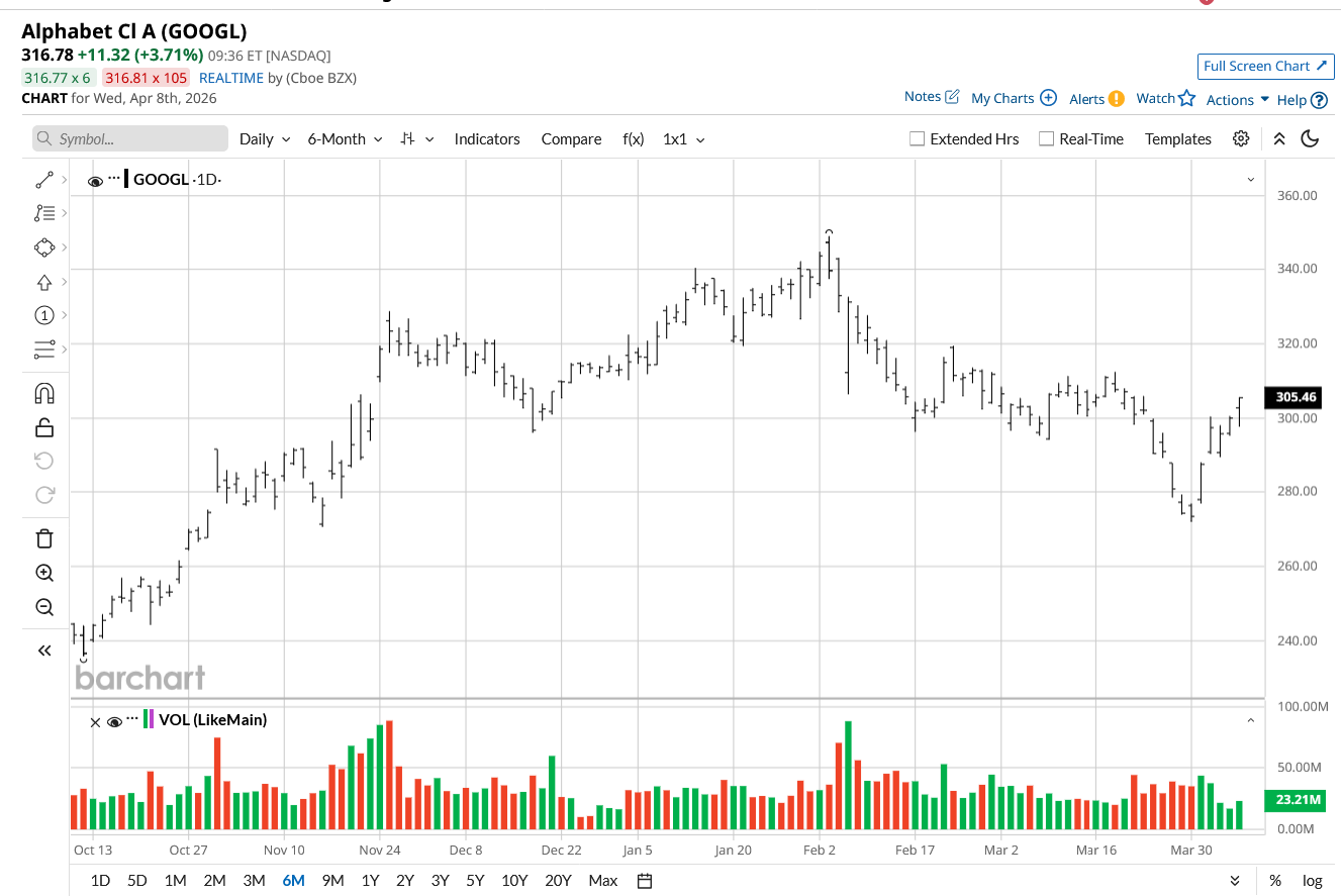 Alphabet’s stock sees extended volatility following an all-time high of $349 in early February, followed by a 20% pullback through March. This correction was largely triggered by investor concerns over the company's aggressive capital expenditure guidance of $175 billion to $185 billion for 2026, aimed at securing dominance in AI infrastructure. Despite this near-term "wall of worry," Alphabet remains a financial fortress with a market capitalization of $3.57 trillion, as bulls argue that the accelerated growth in Google Cloud justifies the current intensive investment cycle.