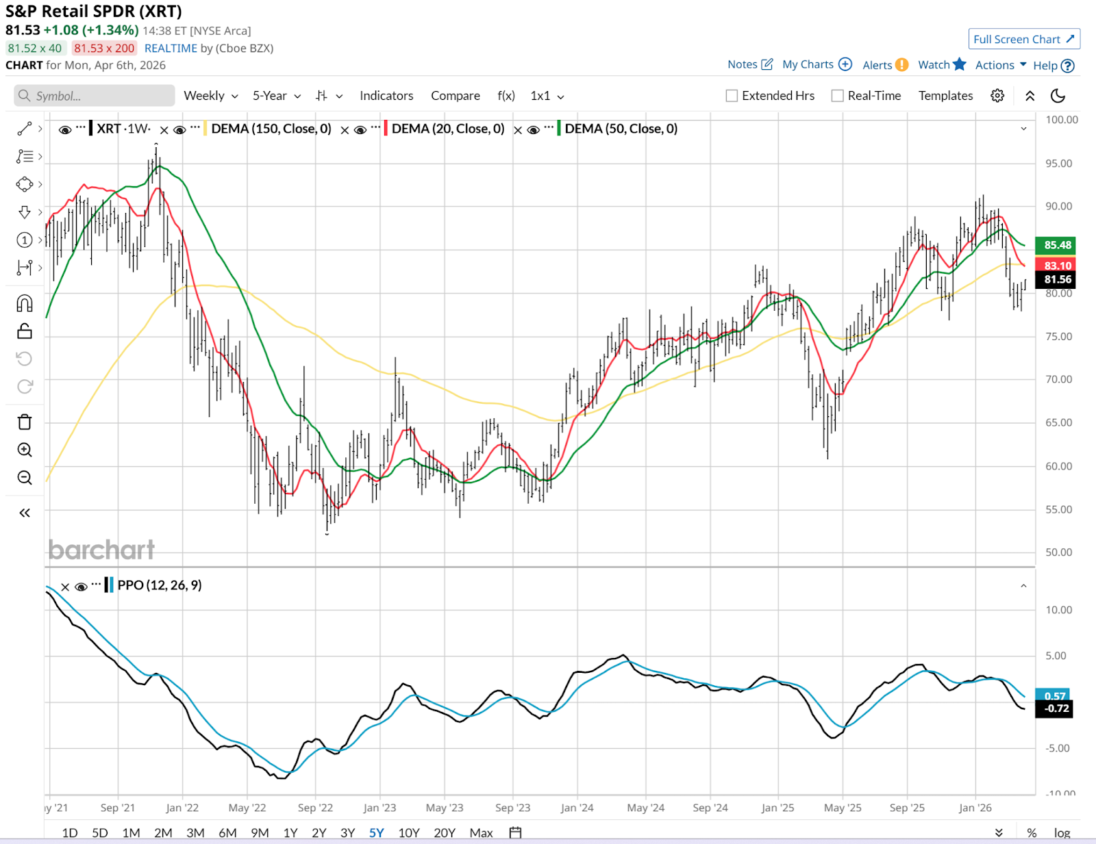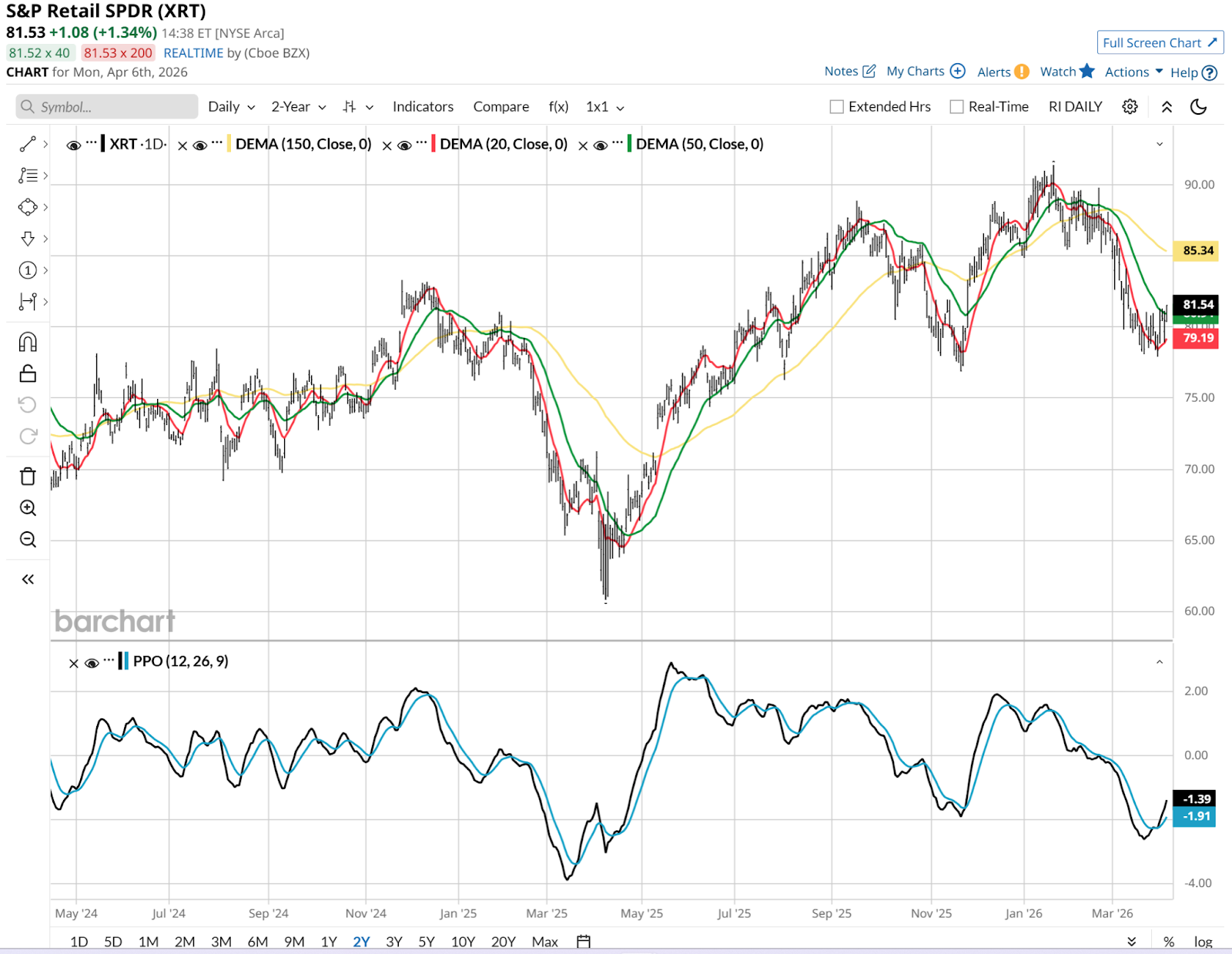 The primary threat to this retail resurgence remains the cost of fuel. Retail is a transportation-heavy industry, and the consumer is highly sensitive to the price at the pump. If geopolitical tensions continue to push energy costs higher, that "real income" surplus could quickly be diverted to the gas tank, stalling the momentum of the discretionary spend. As such, XRT is riding along with the rest of the stock market, as it tries to gauge how the war with Iran and the resulting price of oil will play out.