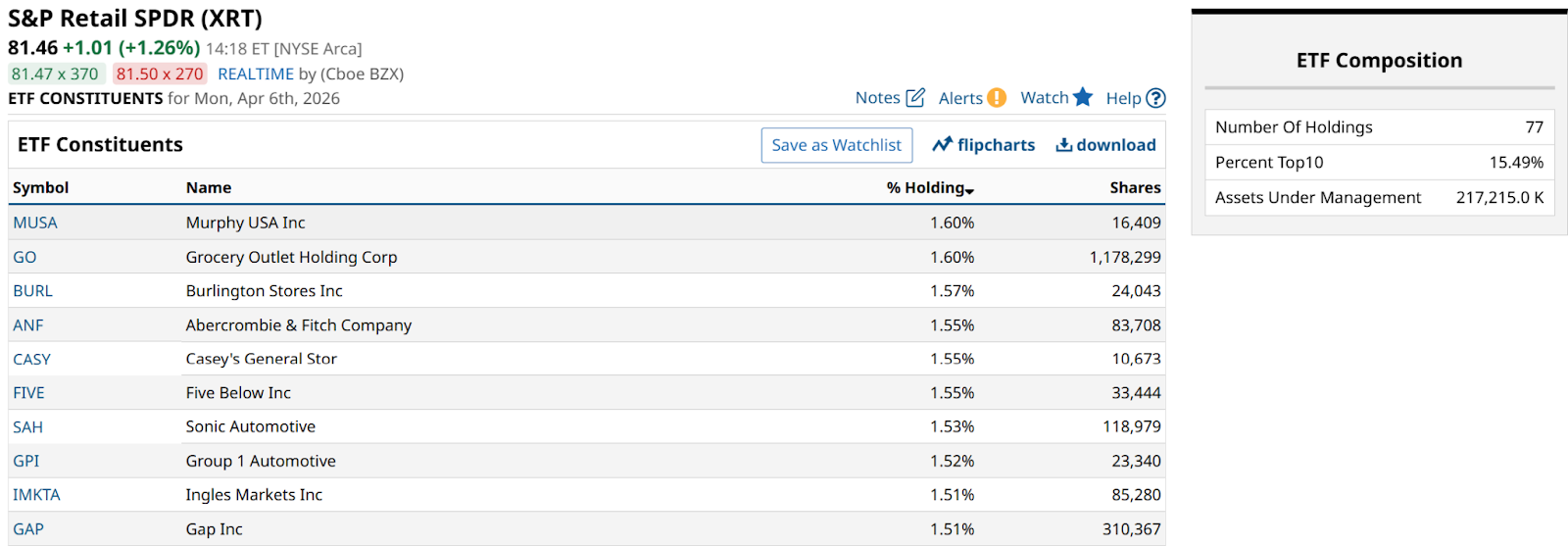 In other words, unlike market-cap-weighted funds that are dominated by a few online giants, XRT’s equal-weighted structure gives every sub-sector — from automotive parts to apparel — an equal voice in the performance.