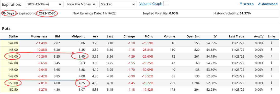 For example, look at the Dec. 30 expiration option chain (below) from Barchart, which is just 36 days forward or a little over one month. The out-of-the-money (OTM) put premium for the $150 strike price, which is almost 8.0% (7.81%) below the closing price on Friday, Nov. 25 of $162.70, has a very high premium of $4.25 per put contract.