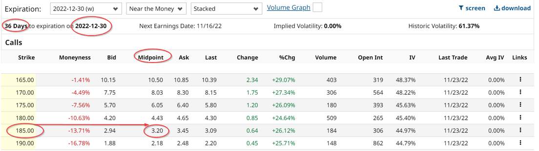 For example, the Barchart call option chain below shows that the $180 strike price has a $4.43 premium. This strike price is 10.6% over today's price. To be even more conservative (in case NVDA keeps rising by Dec. 30) the $185.00 strike price offers a premium of $3.20. This strike price is 13.7% over today's price.