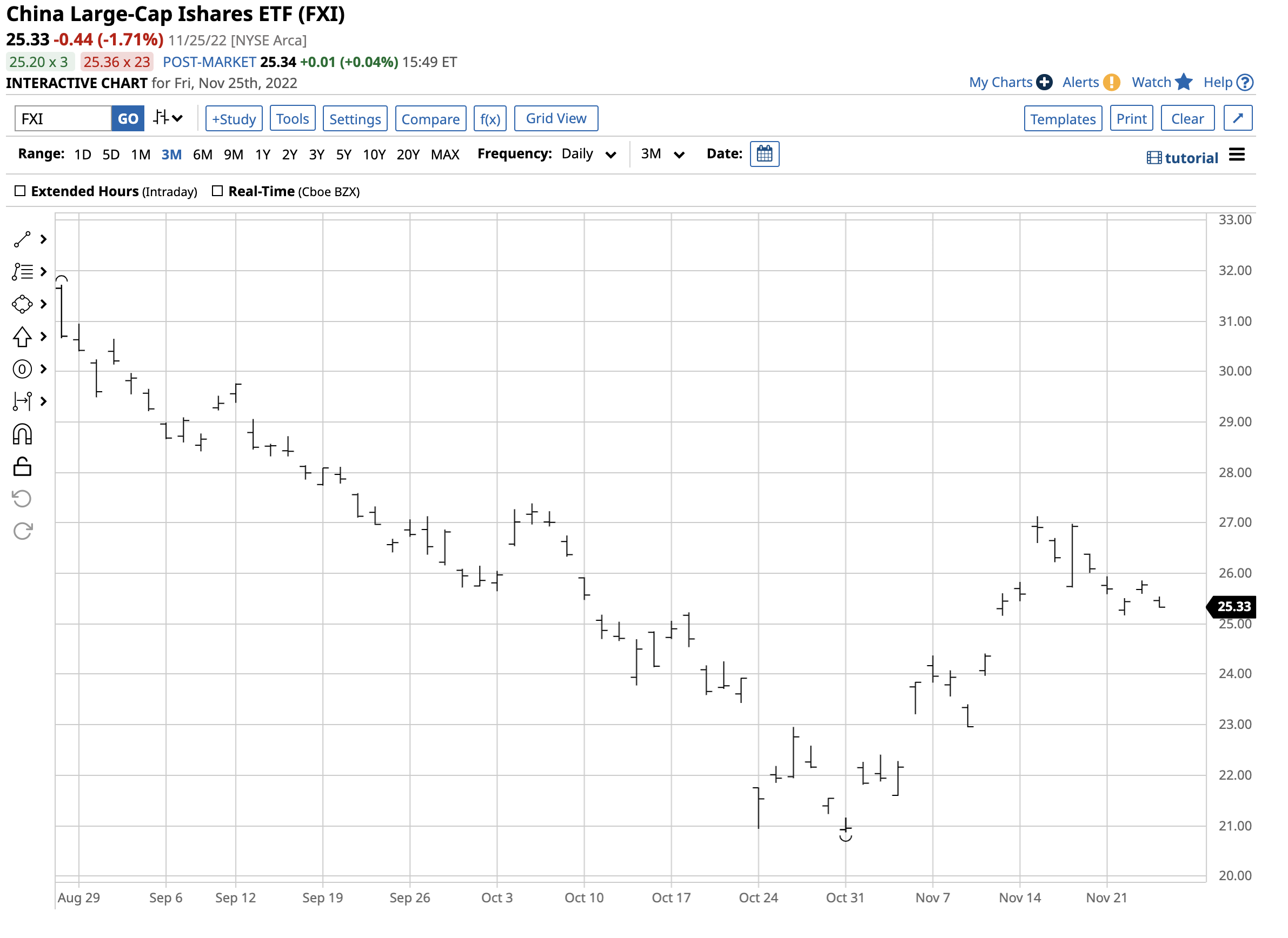 The FXI chart shows the move from $36.58 on December 31, 2021, to the $25.33 level on November 25, a 30.8% decline.