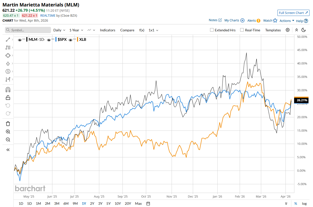 MLM stock has surged 37.2% over the past 52 weeks, outperforming the S&P 500 Index’s ($SPX) 35.7% rise and matching the State Street Basic Materials Select Sector SPDR ETF’s (XLB) 37.2% rise during the same time frame.