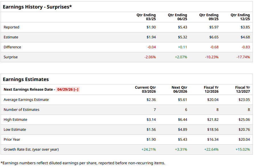 For fiscal 2026, analysts project the company’s earnings per share to be $20.04, up 22.6% from $16.34 in fiscal 2025. Moreover, its EPS is expected to rise 15% year over year (YoY) to $23.05 in fiscal 2027.