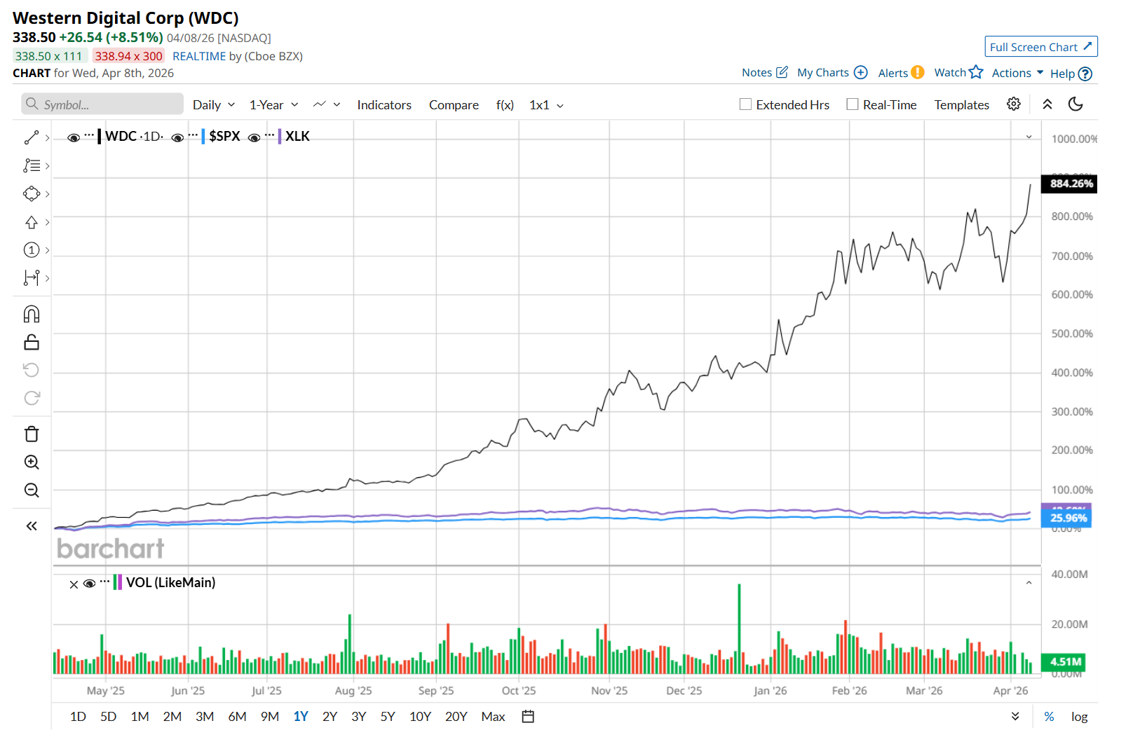 WDC has skyrocketed 960.4% over the past 52 weeks, significantly outperforming both the S&P 500 Index's ($SPX) 30.7% return and the State Street Technology Select Sector SPDR ETF’s (XLK) 49.8% uptick over the same time period.